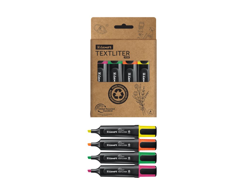 • ekologické zvýrazňovače v sadě • extra pevný plstěný hrot • seříznutý hrot • šíře stopy 1-3,5 mm • barevná náplň na vodní bázi • světlo stálý a rychleschnoucí inkoust • nepropíjí se běžným papírem • víčko s klipem k uchycení, zabraňuje skutálení • ploché černé tělo s barevným víčkem vyrobeno z recyklovaného materiálu • provedení GRS 70 % použitého plastu je z recyklovaného polypropylenu, certifikováno Global Recycled Standard pro udržitelnou výrobu provedení GRS – sada žlutá, zelená, oranžová, růžová • Luxor PCW420/4BX • 4 ks v baleníEAN: 8901069106387