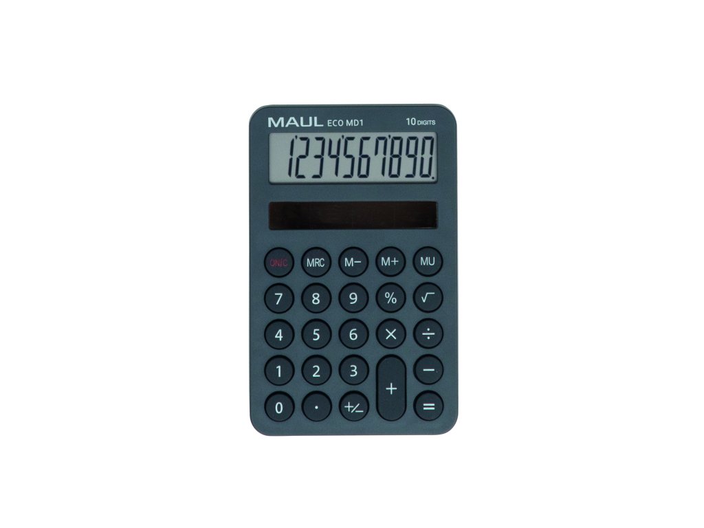 •10 místný LCD displej •1 řádkový • 3 klávesová paměť •automatické vypínaní •pogumované klávesy • oceněno ekologickou cenou "Blue Angel" •dobré pro životní prostředí • solární napájení • vyrobeno z 60% recyklovaného materiálu • ergonomický nakloněný displej •velikost 12 x 7,6 x 1,3 cm•váhá 64 g • šedá barva •Maul ECO 7275084 MD 1