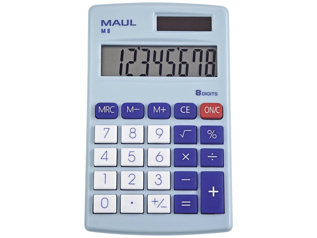 Kapesní kalkulačka MAUL M8 , světle modrá•8místný LCD displej •1řádkový displej •3-klávesová paměť •procentní klíč •Výpočet kořenů •automatické vypínání •pogumované klávesy •obsahuje jednu baterii (LR1130) • hmotnost 45g • rozměry: 11,5 x 6,9 x 1,0 cm • H7261034