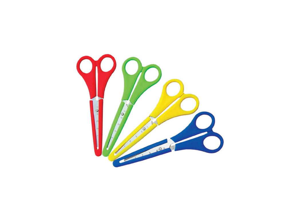 Nůžky s praktickým plastovým krytem na ostří. Bezpečný kulatý hrot. Plastová rukojeť v barevném mixu červené, modré, žluté a zelené barvy. Nůžky mají vyznačené pravítko na ostří z nerezové oceli. Rozměr 14,7 x 5,3 x 1,1 cm. V balení po 24 ks.