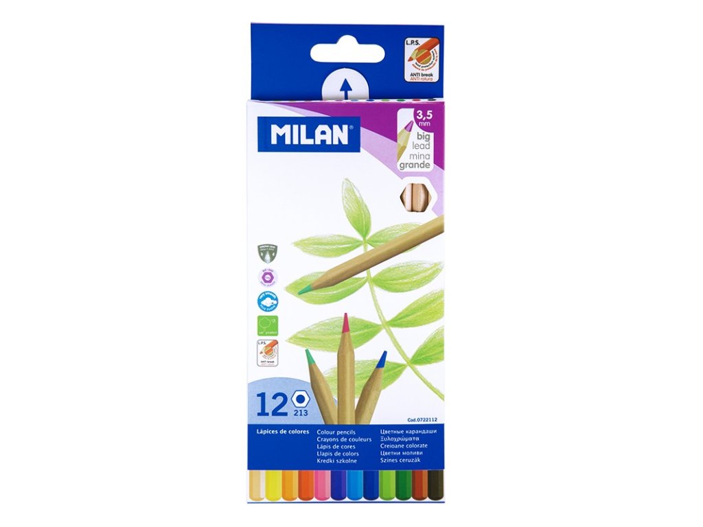 MILAN set 12 kusů šestihranných pastelek s velkou tuhou z nelakovaného přírodního dřeva • tělo pastelky vyrobené ze dřeva z obnovitelných zdrojů • silná tuha o průměru 3,5 mm odolná proti zlomení, lepená systémem LPS • praktické uložení v plastovém zásobníčku s papírovým přebalem • MILAN 0722112 set 12ti odstínů pastelek 213 BIG LEADEAN: 8411574017950
