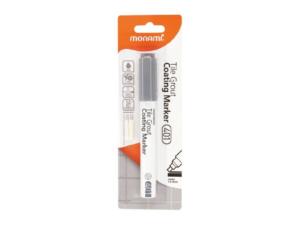 • šedý popisovač s krycí barvou pro opravu nevzhledných spár v koupelnách a na kuchyňských obkladech • neprůhledná stopa • potlačuje růst plísní díky antibakteriální složce • zkosený hrot • stopa 1,5 – 4 mm • součástí balení jsou dva náhradní hroty • dostupné ve třech barvách bílé, šedé a béžové pro sladění s různými interiéry • před každým použitím je nutné popisovač protřepat, stlačit hrot a počkat na nasáknutí inkoustu do hrotu • Monami 401 • 12 ks v baleníEAN: 8801067042987
