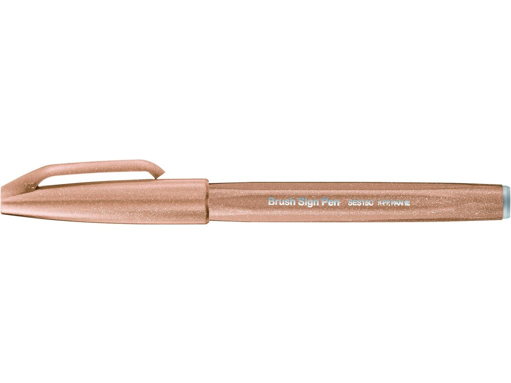 pale brown popisovač Pentel SES15-E2X se štětečkovým hrotem v kovové objímce, tzv. brushpen • Pentel Sign Pen - známý na sociálních sítích jako „Penteltouch“ nebo "Pentelsignpen" • měkčí flexibilní vlákna štětečku s proměnnou šířkou stopy od extra jemných po středně široké • stopa se mění dle přítlaku od tenké linky po sílnější stopu • hrot se vždy vrátí do původního tvaru, vhodné i pro začátečníky • skvělé pro kaligrafii, brushlettering, krasopsaní, kreslení, ilustrace, lineart • inkoust na vodní bázi, stopa je rozmyvatelná vodou, dá se použít pro blendování • lze vytvářet i ombré efekty, pokud se hroty dvou různých barev dotknou, inkousty se vzájemně propojí a následným psaním se přenášejí v mnoha odstínech na papír až je hrot opět v původní barvě • plastové tělo s ergonomickým úchopem včetně víčka s klipem vyrobeno z 81% recyklovatelného materiálu. Brush pen popisovač Pentel SES15 Sign Pen se štětečkovým hrotem v kovové objímce, jsou vhodné i pro začátečníky, kteří teprve krasopis, handlettering, lineart poznávají. Hrot se přizpůsobí tlaku psaní a vytváří od extra jemných po středně široké stopy, vlákna štětetečku brush pen Sign Pen Pentel se vždy vrátí do původního tvaru. Štětečkové popisovače Pentel SES15 lze využít i pro akvarelovou tvorbu, inkoust je na vodní bázi, je rozmývatelný vodou. Plastové tělo s ergonomickým úchopem, včetně víčka s klipem vyrobeno z 81% recyklovatelného materiálu. Sign Pen Brush - známý na sociálních sítích jako „Pentel touch“ . Skvělé pro začátečníky pro handlettering, kaligrafii, kreslení, ilustrace, akvarely, pokročilým uživatelům lze doporučit pro lineart, ombré efekty, blanding.EAN: 4902506365156,4902506365033