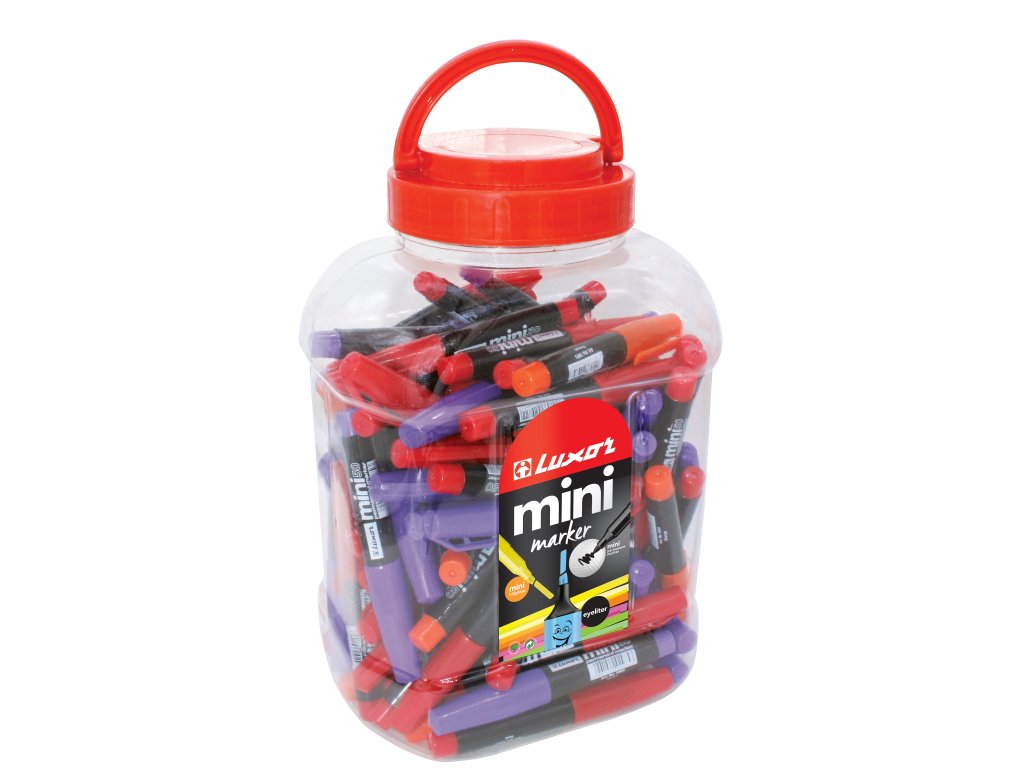 • permanentní • kulatý hrot • extra pevný akrylový hrot • šířka stopy 1-2 mm • inkoust na bázi alkoholu • neobsahuje xylen ani toluen • nesmyvatelný, voděodolný • popisuje většinu povrchů • mini provedení o délce 6 cm • víčko s klipem • v nabídce odběr pouze v dóze 100 ks mix: 30 ks černých, po 10 ks červených, modrých, zelených, hnědých, oranžových, růžových a fialových popisovačů • Luxor 3000/100 Jar mini mix barev • 100 ks v dózeEAN: 8901069673568