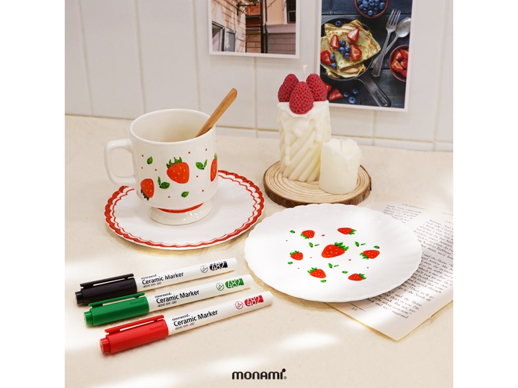 • popisovače na keramiku a porcelán, varné sklo • speciální inkoust s možností zapékání – odolný vysokým teplotám • kulatý hrot • syté barvy - černá, fialová, modrá, zelená, žlutá, oranžová, červená, hnědá • přesná stopa • šíře stopy 0,7 mm • po úplném zaschnutí lze dekorovaný předmět zapéct pro trvalou fixaci • mikrovlnná trouba 700 W na 8 min (domácí použití) / 1000 W na 6 min 30 s (profesionální použití), pečicí trouba: 165 °C na 15 min • pigmentový inkoust na vodní bázi zůstává stálý i během mytí • před každým použitím je nutné popisovač protřepat, stlačit hrot a počkat na nasáknutí inkoustu do hrotu • plastové tělo, víčko s klipem pro snadné přenášení a pohodlné používání • dekorovaný materiál musí být důkladně odmaštěn • široké využití na dekorace hrnků, talířů, misek • ideální pro design, umělecké projekty, školní práce nebo profesionální dílny • skladování popisovačů pouze ve vodorovné poloze • sada 8 barev • Monami 482/8EAN: 8801067275125