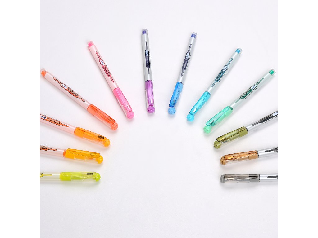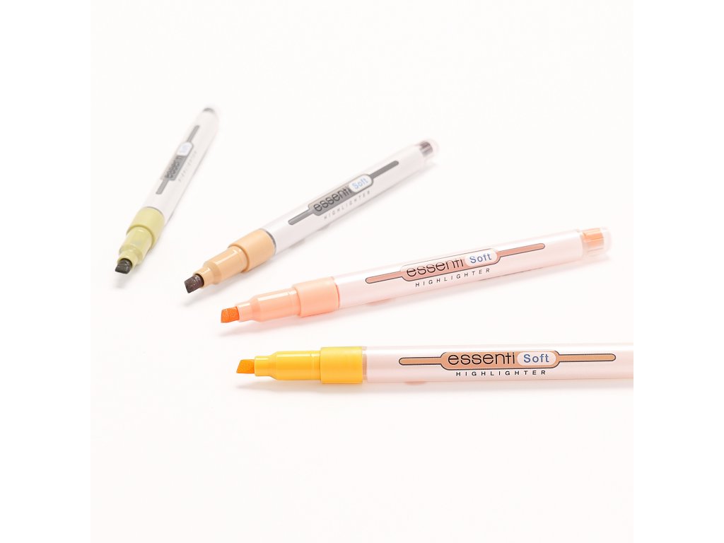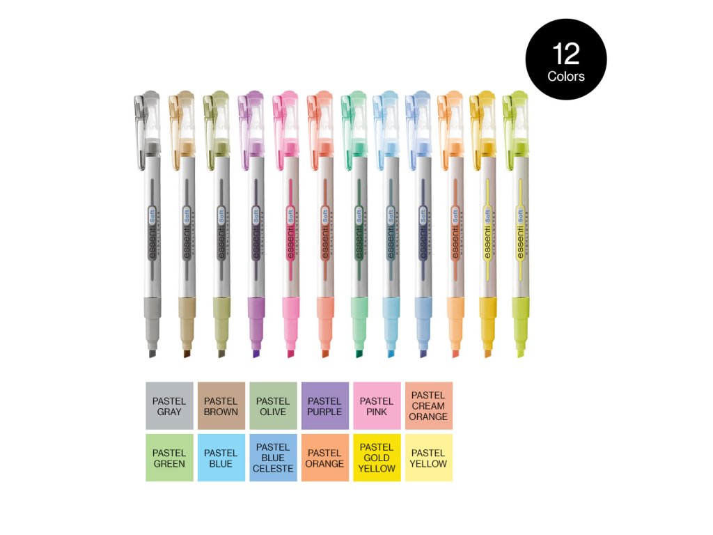 • zvýrazňovače kolekce Essenti • klínový hrot • stopa 1 – 4 mm • štíhlé tělo • praktické víčko s klipem, které lze připnout na zápisník, kapsu nebo tašku • provedení Essenti Bright se zářivými a jasnými barvami, které okamžitě přitáhnou pozornost v sadě 6 odstínů • provedení Essenti Soft s jemnými pastelovými odstíny, příjemnými pro oči a vytvářející uklidňující dojem • harmonický vzhled, promyšlená funkčnost • Monami Essenti Pastel • sada 12 pastelových odstínůEAN: 8801067730846